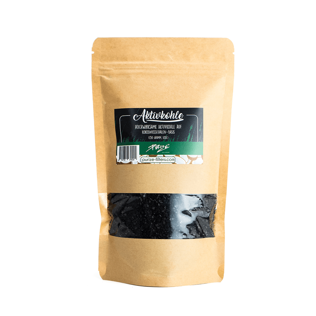 • PURIZE® active charcoal based on coconut, bulk packed in a 150 g stand-up pouch, perfect for filling active carbon adapters or other smoking accessories.